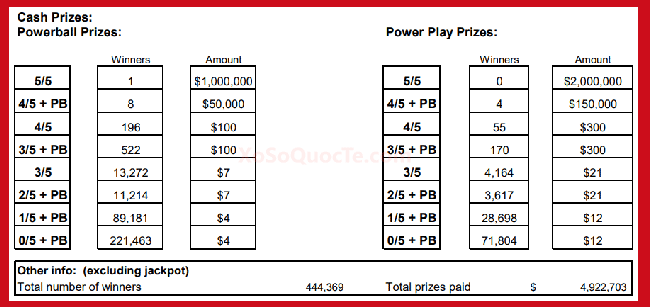 Powerball đã 1 giải Nhất $1,000,000 cho người chơi tới từ bang New York. Đồng thời, giải xổ số này cũng trao tới 12 giải Nhì, Trong đó, có 7 người mỗi người nhận được $50,000 (tương đương hơn 1,1 tỷ VNĐ), 4 người nhận được $150,000 với Power Play 3X, và 1 người trúng $23,192, cùng với đó là rất nhiều giải thưởng nhỏ hơn khác.
