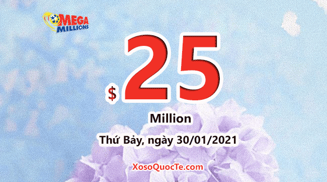 Giải jackpot của Mega Millions sắp tới là $25 triệu đô-la tương đương 575 tỷ đồng, cho phiên quay thưởng sẽ diễn ra vào Thứ Bảy, ngày 30/01/2021 (giờ Việt Nam).
