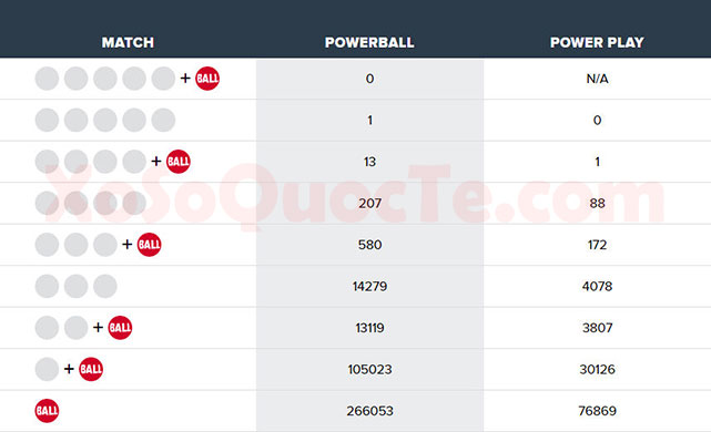 Cụ thể, có 1 người may mắn trở thành triệu phú khi trúng Giải Nhất và nhận được giải thưởng trị giá $1 triệu đô-la nhờ sở hữu tấm vé có 5 cặp số màu trắng trùng với kết quả xổ sổ, chỉ sai duy nhất số Power Ball màu đỏ, ngoài ra còn có 14 tấm vé trúng Giải Nhì – theo thông tin từ hãng xổ số PowerBall.