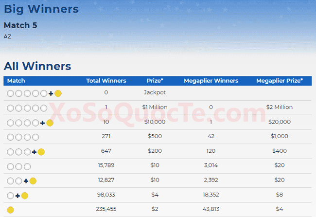 Cụ thể, theo thông tin từ hãng xổ số Mega Millions đã ghi nhận có 1 người trúng Giải Nhất khi sở hữu tấm vé (được mua tại Arizona) có 5 cặp số đầu tiên màu trắng trùng với kết quả xổ số và nhận được giải thưởng trị giá $1 triệu đô-la. Ngoài ra, còn có 10 người khác trúng Giải Nhì, trong đó có 1 người sở hữu thêm tùy chọn Ngôi Sao May Mắn – Megaplier.