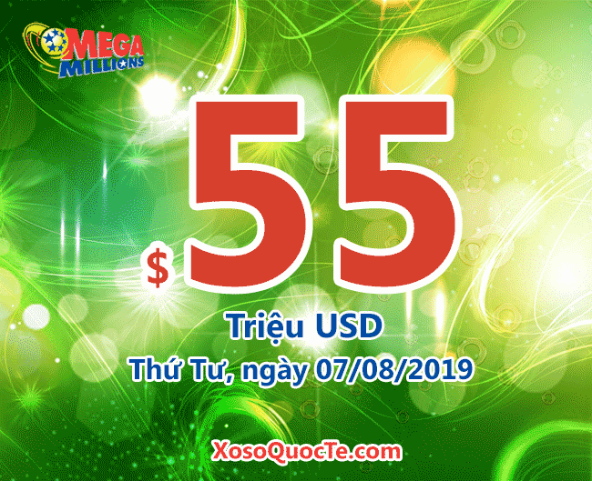 Theo kết quả chính thức từ hãng xổ số Mega Millions, phiên quay thưởng ngày 03/08/2019 (giờ Việt Nam) chưa ghi nhận ai trúng jackpot $50 triệu đô-la. Theo đó, mức thưởng cao nhất của giải xổ số hấp dẫn này tăng lên mốc $55 triệu USD.