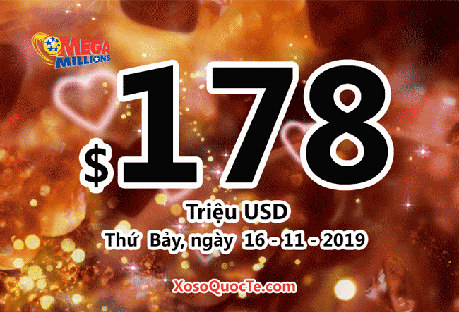 Giải thưởng cho lần quay số tiếp theo của xổ số Mega Millions diễn ra vào Thứ Bảy, ngày 16 tháng 11 năm 2019 (giờ Việt Nam) tăng lên $178 triệu USD tương đương hơn 4,094 tỷ VNĐ.