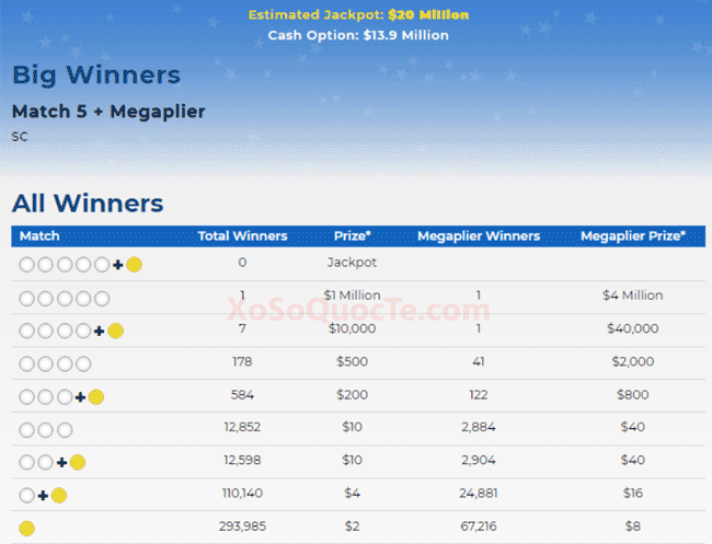 Trong phiên quay thưởng này, người chơi may mắn nhất mua vé tại bang South Carolina và trúng thưởng $4,000,000 nhờ quyền chọn Megaplier 4X. Đồng thời, có 5 người nhận giải Nhì $10,000 từ xổ số Mega Millions, 1 người nhận được giải Nhì $40,000 với ngôi sao may mắn Megaplier 4X,và 1 người chơi mua vé tại California trúng $11,775.