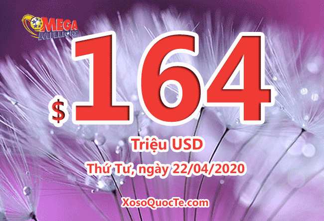 Vẫn giữ vị trí là giải xổ số tự chọn lớn nhất thế giới, giải Mega Millions của Mỹ tiếp tục tăng lên $164 triệu đô-la. Phiên quay thưởng diễn ra vào ngày 18/04/2020 tìm thấy 1 người chơi trúng $4 triệu đô.