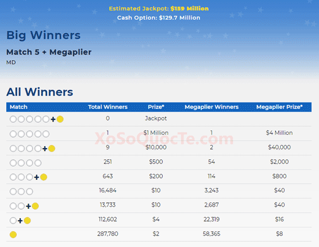 Tuy chưa tìm được chủ nhân của Jackpot nhưng phiên quay thưởng lần này đã ghi nhận có 1 người mua tấm vé tại bang Maryland may mắn trở thành triệu phú đô-la khi trúng Giải Nhất. Người chơi may mắn này nhận được giải thưởng trị giá $4 triệu USD nhờ việc sở hữu những tấm vé có 5 cặp số màu trắng trùng với kết quả xổ sổ, chỉ sai duy nhất số Mega Millions màu vàng, và Megaplier 4X. Ngoài ra, còn có 9 tấm vé khác may mắn trúng Giải Nhì với phần thưởng từ $7,268 tới $40,000 đô-la.