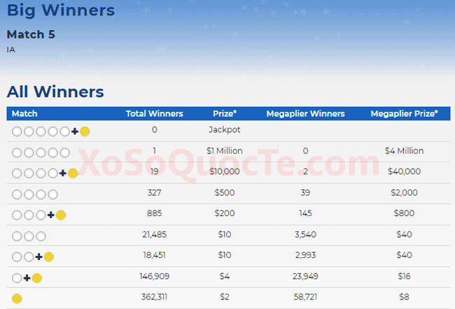 Người may mắn nhất phiên quay thưởng xổ số Mega Millions ngày 20/04/2019 (giờ Việt Nam) là một người đến từ bang Iowa. Người này đã nhận giải Nhất trị giá $1 triệu USD. Mức jackpot Mega Millions đã tăng lên thành $192 triệu USD.
