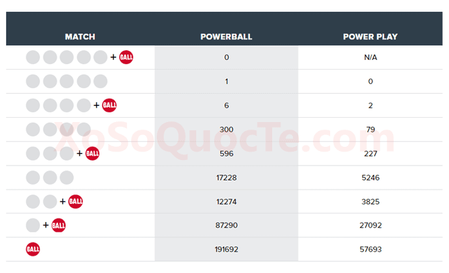 Có 1 người mua tấm vé tại Nebraska đã trúng giải Nhất của xổ số Powerball và nhận được $1 triệu đô-la. Cùng với họ là 8 người đạt giải Nhì và hàng loạt các giải nhỏ hơn mà bạn có thể theo dõi trong bảng dưới đây. Với 5 người nhận được $50.000 đô-la (tương đương 1,1 tỷ VNĐ) và 2 người may mắn hơn nhận được $100.000 đô-la nhờ vào Power Play 2X và 1 người mua vé tại California nhận được $20.871 đô-la.