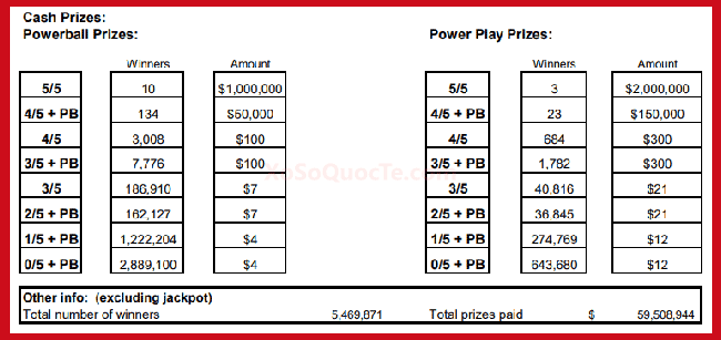 Xổ số Powerball xác nhận: đã có 8 phần thưởng trị giá $1 triệu đô-la cho những người chơi tới từ các bang Florida (1), Indiana (1), Michigan (1), New York (1), Ohio (2), Texas (2).