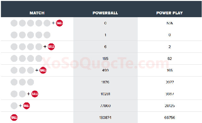 Kết quả xổ số tự chọn Powerball ngày 21/10/2021 (giờ Việt Nam) ghi nhận có 1 giải Nhất trị giá $1 triệu USD dành cho người chơi mua vé tại bang North Carolina. Cùng với người sở hữu tấm vé may mắn này là 5 người may mắn trúng Giải Nhì $50,000; 2 người chơi trúng gấp đôi là $100,000 với Power Play 2X; và 1 người chơi mua vé tại bang California nhận được $19,607.