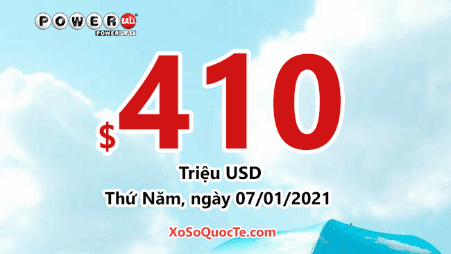 Giải thưởng cho lần quay số kế tiếp của xổ số Powerball diễn ra vào Thứ Năm, ngày 07 tháng 01 năm 2021 (theo giờ Việt Nam) tăng lên mốc $410 triệu USD.