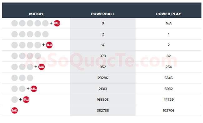 Trong phiên quay thưởng xổ số Powerball này có tới 4 triệu đô đã được trao. Trong đó là 2 tấm vé trúng $1 triệu USD được mua tại bang New Mexico và Wisconsin; tấm vé còn lại trúng $2 triệu đô xuất hiện tại North Carolina (theo quy định, với mức thưởng này, Power Play luôn là 2X; vậy nên giá trị giải Nhất dù ở phiên có Power Play 5X xuất hiện vẫn sẽ là $2 triệu đô-la). Ngoài ra còn là 16 giải Nhì, trong đó là 14 giải $50.000 đô-la và 2 giải $250.000 đô-la nhờ dấu tích Power Play 5X.