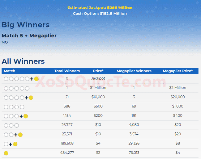 Xổ số Mega Millions đã trao 1 giải $2 triệu đô cho người chơi mua vé từ bang Missouri. Cùng với đó là 21 người trúng Giải Nhì và rất nhiều giải nhỏ hơn khác.Lần quay số kế tiếp của xổ số Mega Millions diễn ra vào Thứ Bảy, ngày 07 tháng 12 năm 2019 với jackpot đã tăng lên tới $285 triệu USD.