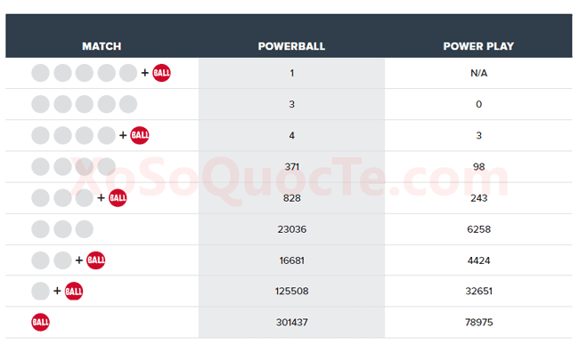 Người may mắn nhất trúng jackpot của Powerball đã mua tấm vé của mình tại New York. Cùng với đó, phiên quay thưởng lần này còn ghi nhận 3 người trúng Giải Nhất. Ba người chơi đến từ Colorado, Nebraska, và Ohio mỗi người nhận được $1 triệu đô từ Powerball. 7 người chơi may mắn sở hữu những tấm vé có 4 cặp số trùng với 4/5 cặp số của kết quả xổ số Powerball và con số Powerball màu đỏ đã trúng giải Nhì. Cụ thể, 3 người nhận được giải thưởng mỗi giải trị giá $50,000; 3 người còn lại nhận được giải thưởng mỗi giải trị giá $150,000 nhờ sở hữu thêm tùy chọn Ngôi Sao May Mắn – PowerPlay 3X và 1 người California nhận $35,271. Ngoài ra là rất nhiều giải thưởng nhỏ hơn khác.Danh sách 10 giải độc đắc lớn nhất trong lịch sử xổ số Powerball dưới đây sẽ đem tới cho bạn cái nhìn tổng quan hơn về độ “khủng” của những giải thưởng ngàn tỷ hấp dẫn bậc nhất hành tinh của Powerball: