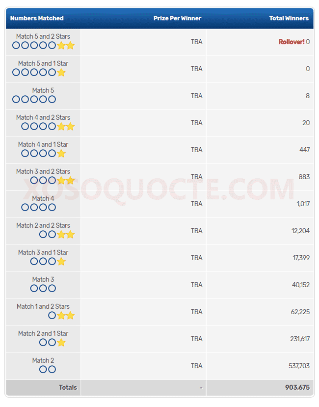 Giải thưởng Jackpot cho lần quay số kế tiếp của xổ số Euro Millions sẽ diễn ra vào Thứ Bảy, ngày 04 tháng 04 năm 2020 (giờ Việt Nam) là €37 triệu Euro tương đương hơn 962 tỷ VNĐ.