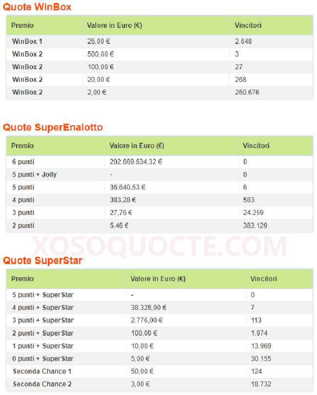Trong phiên quay thưởng ngày 12/05/2022 (giờ Italia), có 6 người sở hữu những tấm vé trùng 5/6 số thường trị giá €36,640.53 và 7 người mua được những tấm vé trùng 4/6 số thường cùng số Superstar và trúng được €38,328. Bên cạnh đó là rất nhiều giải thưởng nhỏ hơn khác được thông báo trong bảng kết quả dưới đây.