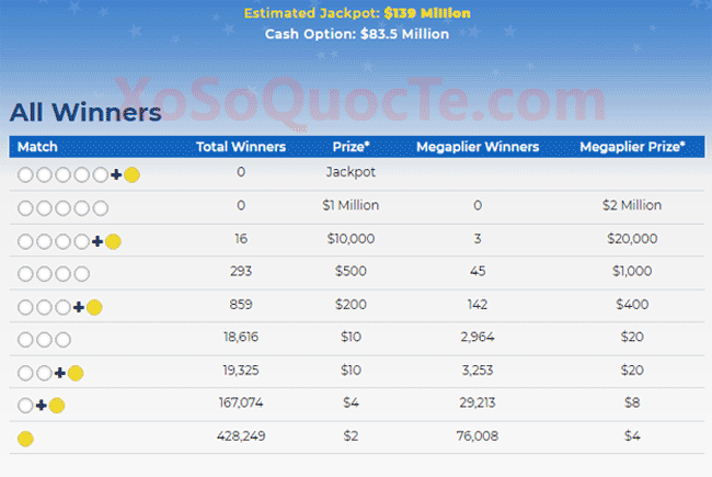 Tại phiên này, jackpot $139 triệu đô cũng như các giải Nhất đều chưa xuất hiện. Vậy nhưng xổ số Mega Millions cũng đã trao rất nhiều giải cho những người chơi may mắn. Đó là 13 người chơi nhận giải Nhì trị giá $10.000 đô-la; là 3 người chơi khác nhận tới $20.000 đô-la (tương đương hơn 1.1 tỷ VNĐ) nhờ ngôi sao may mắn Megaplier 2X xuất hiện trong phiên; và rất nhiều giải thưởng nhỏ hơn khác.