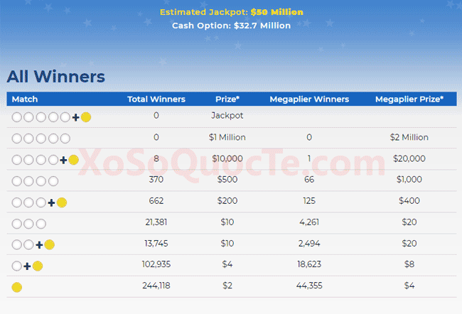 Thông tin chia sẻ trên blog này dành cho những bạn đọc yêu thích các giải thưởng xổ số quốc tế "nghìn tỷ" đang sinh sống tại các quốc gia cho phép dịch vụ mua hộ vé số quốc tế được phép hoạt động. Khi truy cập XoSoMy.com bạn đọc cần hiểu rằng thông tin trên website chỉ mang tính tham khảo từ những chia sẻ kinh nghiệm thực tiễn cá nhân của tác giả khi chơi xổ số quốc tế như Powerball, Mega Millions,...; Tác giả trang web XoSoMy.com không cung cấp dịch vụ mua hộ bất kỳ loại vé số quốc tế nào! Để mua vé số quốc tế bạn hãy tự chọn lựa cho mình một nhà cung cấp dịch vụ mua hộ đáng tin cậy trước khi tham gia cuộc chơi toàn cầu này!