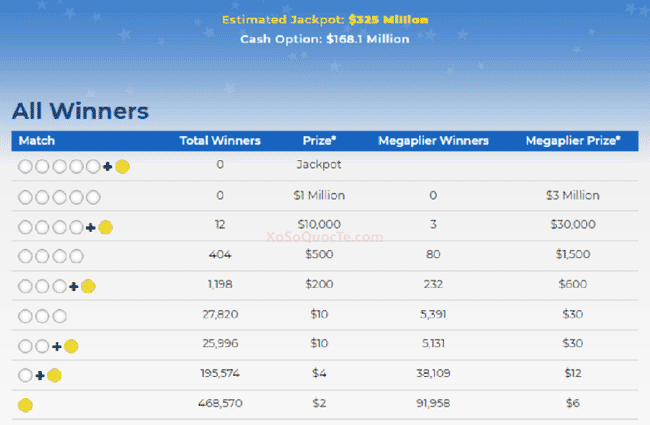 Dù giải đặc biệt chưa thuộc về ai, nhưng phiên quay thưởng này có 8 người trúng $10,000; 3 người chơi may mắn khác nhận được $30,000 nhờ Megaplier 3X – quyền nhân ba lần giá trị giải thưởng; và 1 người chơi bang California trúng $26,829 theo quy định của bang này.