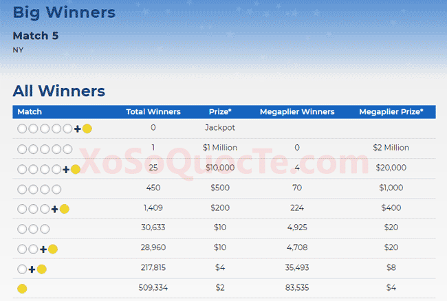 Trong phiên quay thưởng này có 1 người chơi đến từ New York thắng giải Nhất xổ số Mega Millions và nhận được phần thưởng $1 triệu USD. Cùng với đó là rất nhiều giải khác, có 25 người nhận giải Nhì từ xổ số Mega Millions. Cụ thể, có 19 người nhận được $10.000 tương đương hơn 230 triệu VNĐ; 4 người khác nhận được $20.000 nhờ có Megaplier 2X và 2 người California nhận được $14,957 theo quy định của bang này.