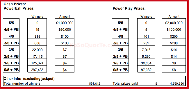 Trong phiên quay thưởng này, xổ số Powerball chưa tìm thấy chủ nhân các giải Nhất. Tuy nhiên, những giải có giá trị lớn như $50,000 đã có chủ. Cụ thể, có 14 người chơi trúng $50,000; 5 người chơi trúng gấp hai lần là $100,000 với Power Play 2X; 1 người chơi mua vé tại bang California trúng $84,763; và nhiều giải thưởng nhỏ hơn khác.
