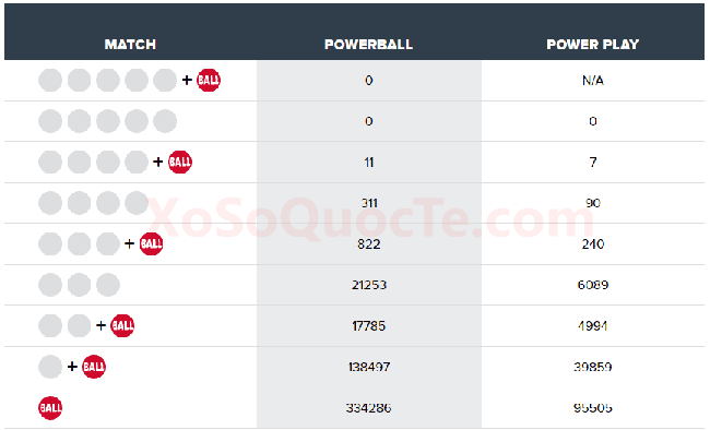 Trong phiên quay thưởng này, xổ số Powerball chưa tìm thấy chủ nhân các giải Nhất. Tuy nhiên, những giải có giá trị lớn như $50,000 đã có chủ. Cụ thể, có 7 người chơi trúng $50,000; 7 người chơi trúng gấp hai lần là $100,000 với Power Play 2X; 4 người chơi mua vé tại bang California trúng $18,730; và nhiều giải thưởng nhỏ hơn khác.