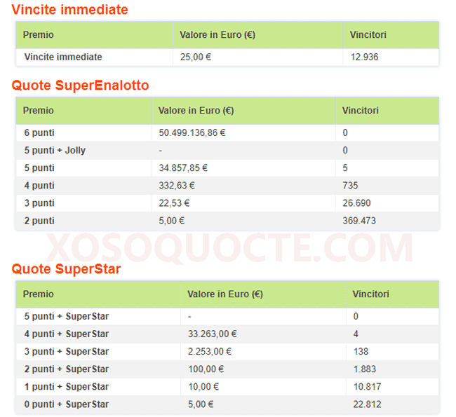 Những người trúng giải lớn nhất trong phiên SuperEnalotto này là 5 người sở hữu các tấm vé trùng 5/6 số thường trị giá €34,857.85 (tương đương hơn 906 triệu VNĐ); và 4 người chơi trúng €33,263 với 4/6 số thường và số Super Star.Ngoài ra là nhiều giải nhỏ hơn khác mà bạn đọc có thể cập nhật trong bảng kết quả dưới đây.