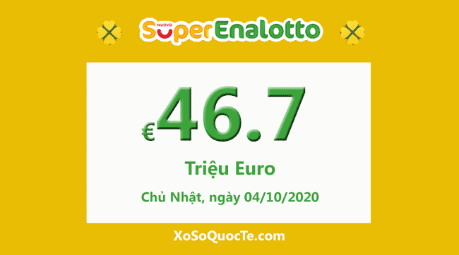Jackpot của SuperEnalotto tìm chủ. Giá trị jackpot này hiện lên tới mức €46,700,000 tương đương với hơn 1214 tỷ đồng. Phiên quay thưởng sẽ diễn ra vào Chủ Nhật, ngày 04/10/2020.