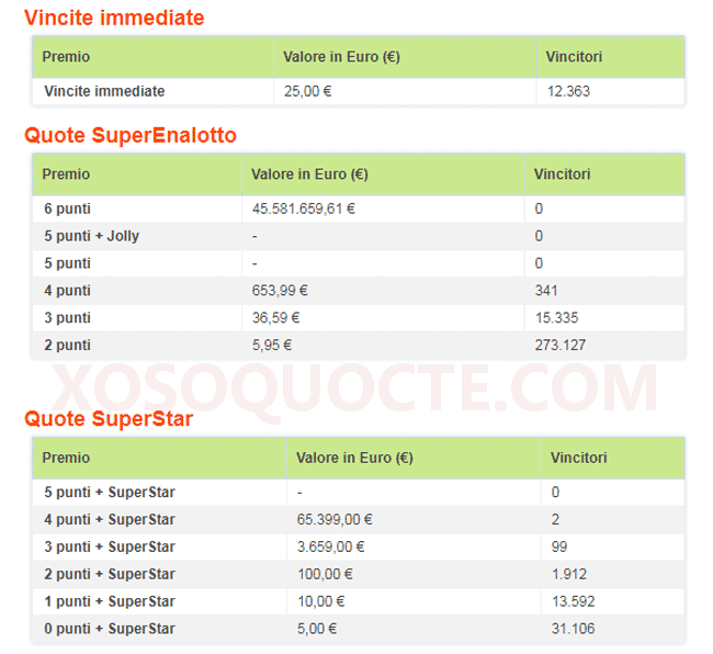 Jackpot của giải xổ số Ý vẫn đang đợi chủ. Những người chơi trúng giải lớn nhất trong phiên SuperEnalotto lần này là 2 người sở hữu những tấm vé trị giá €65.399,00 tương đương hơn 1.7 tỷ đồng với việc trùng 4/6 số thường và số Super Star. Cùng với đó là nhiều giải khác như thông tin trong bảng dưới đây.