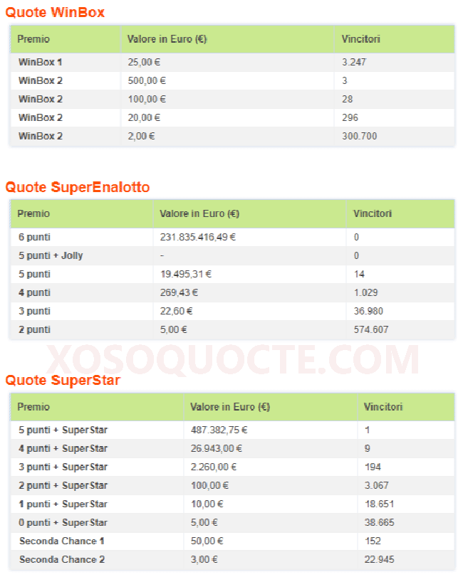 Trong phiên quay thưởng ngày 02/07/2022 (giờ Italia), có 1 người chơi sở hữu tấm vé trùng 5/6 số thường cùng số Superstar trị giá €487,382.75; 14 người mua được những tấm vé trùng 5/6 số thường trúng được €19,495.31; và 9 người mua trúng €26,943 với những tấm vé chứa 4/6 số thường và số SuperStar.