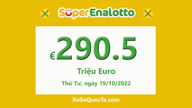 Giải jackpot của SuperEnalotto tiếp tục tăng lên tới €290,500,000 tương đương hơn 6,972 tỷ đồng. Phiên quay thưởng sẽ diễn ra vào Thứ Tư, ngày 19/10/2022.