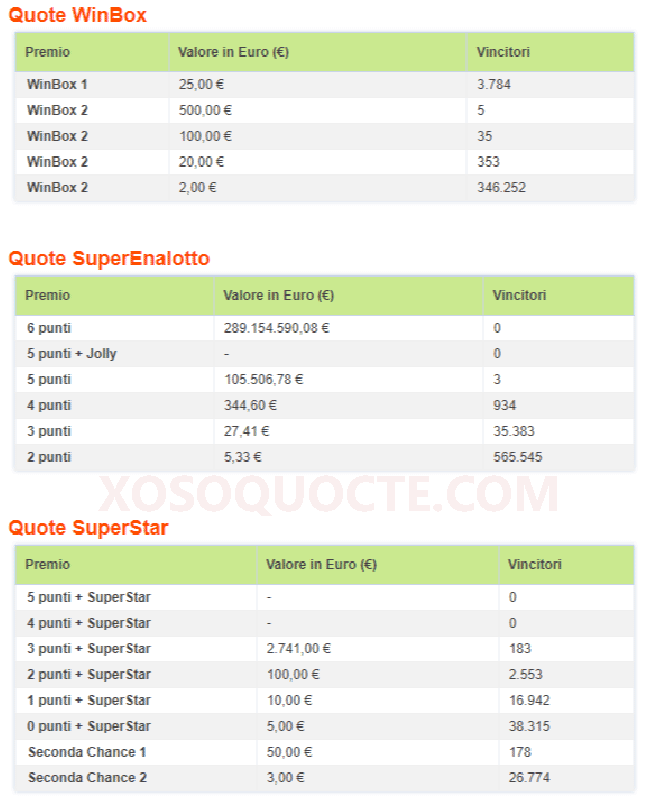 Trong phiên quay thưởng ngày 15/10/2022 (giờ Italia), có 3 người sở hữu những tấm vé trùng 5/6 số thường trị giá €105,506.78 và 183 người mua được những tấm vé trùng 3/6 số thường cùng số Superstar, trúng được €2,741. Bên cạnh đó là rất nhiều giải thưởng nhỏ hơn khác được thông báo trong bảng kết quả dưới đây.